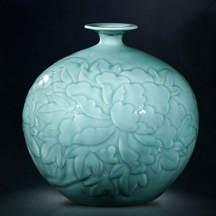 Vintage celadon carved peony textured glazed ceramic vase ornament