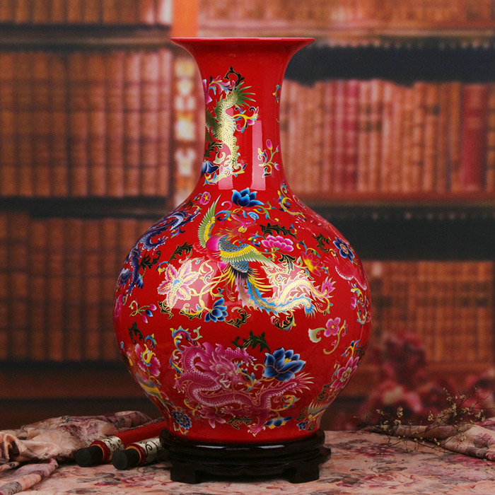 Large crystal glaze red dragon and phoenix auspicious floor vase