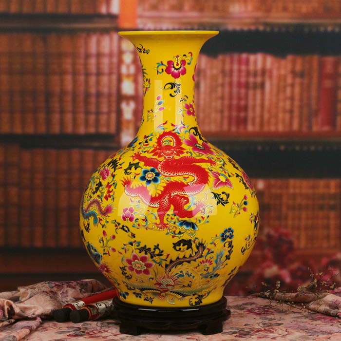 Tall crystal glaze yellow dragon and phoenix floor standing vases