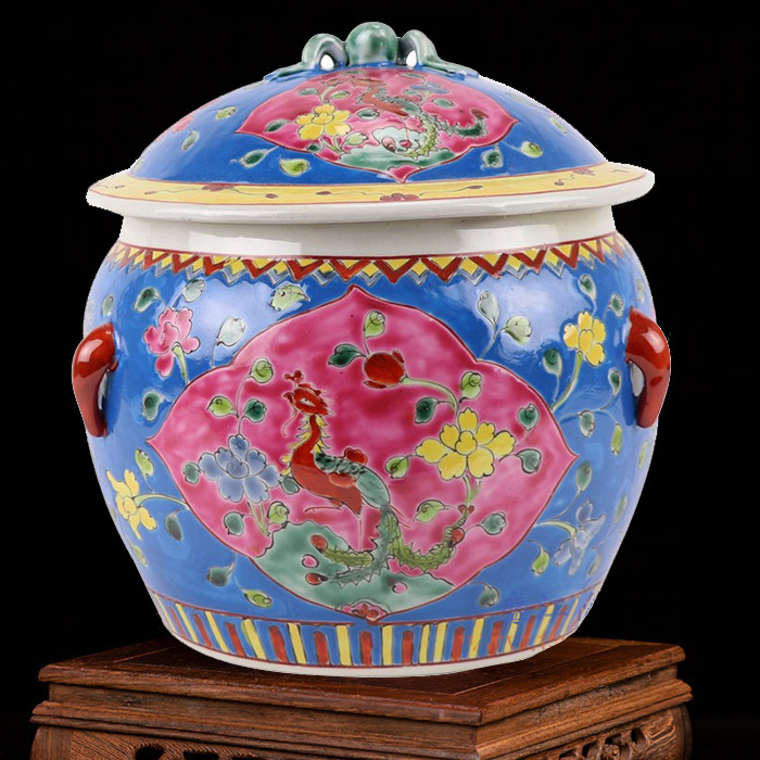 Pastel blue with phoenix pattern storage pottery jar