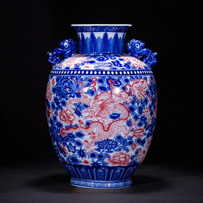 Vintage blue and white glaze red flower vase and ornament with dragon