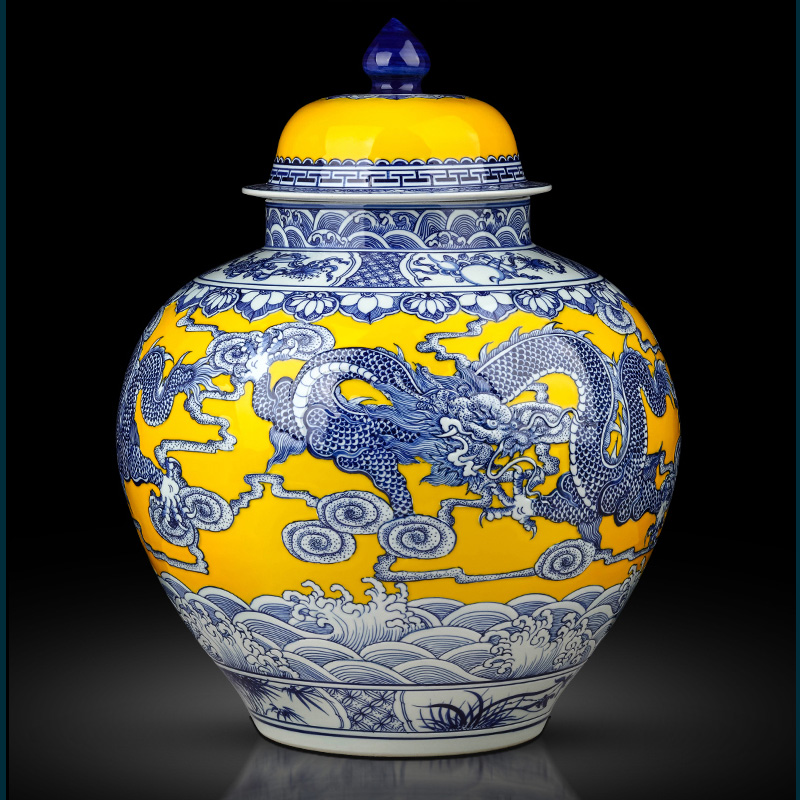 Jingdezhen vintage carving dragon yellow ceramic storage jar home