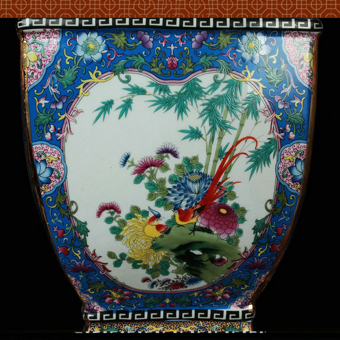 Vintage enamel colorful square flower and bird ceramic flower vase