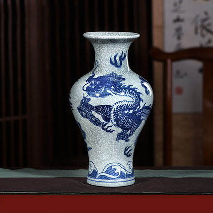 Cracked glazed blue and white porcelain dragon flower vase ornaments