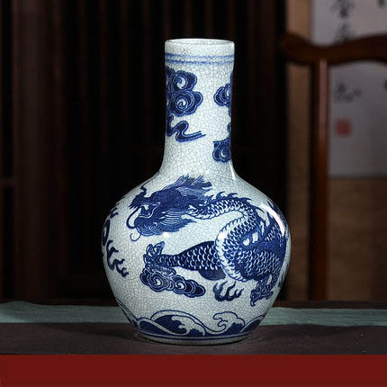 Cracked glazed blue and white ceramic dragon flower vase living room