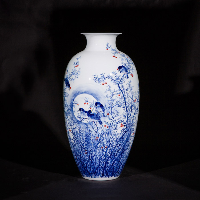 Hand-painted large blue and white ceramic vase with birds and fruits