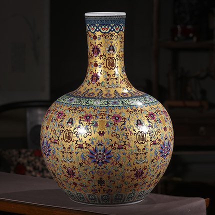 Golden enamel celestial sphere shaped ceramic vase on the ground