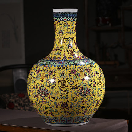 Yellow enamel celestial sphere shaped ceramic vase on the ground