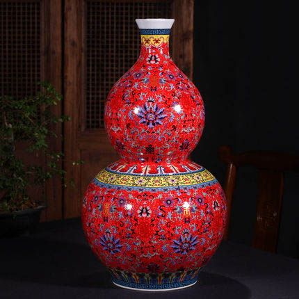 Red enamel gourd shape ceramic vase on the ground