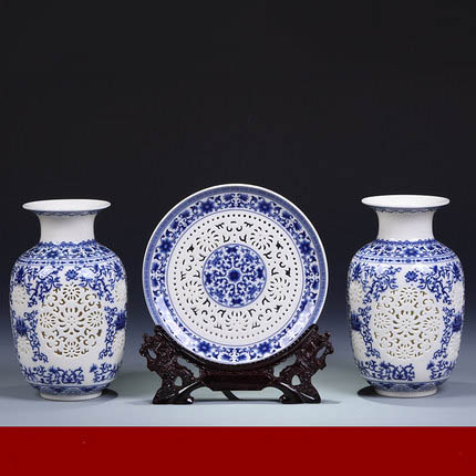 Three-piece hollow blue and white ceramic vase