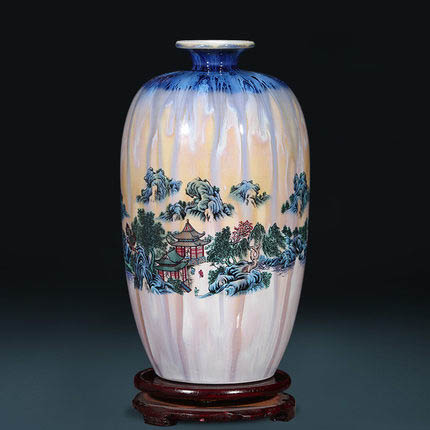 Kiln cracked glazed winter melon shape landscape pavilion ceramic vase