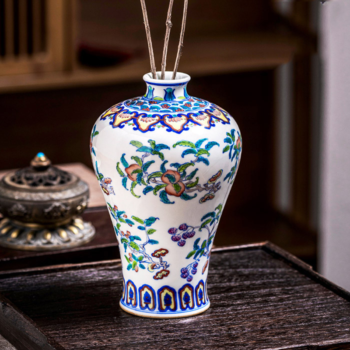 Vintage chinese blue and white ceramic vase with flowers and fruits
