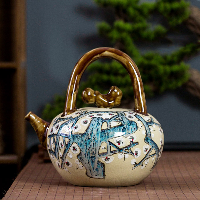 Large capacity ceramic teapot with hand-painted stoneware lift beam