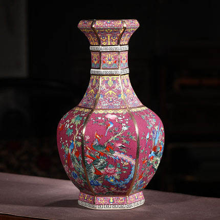 Vintage middle red majolica ceramic vase ornaments outline in gold