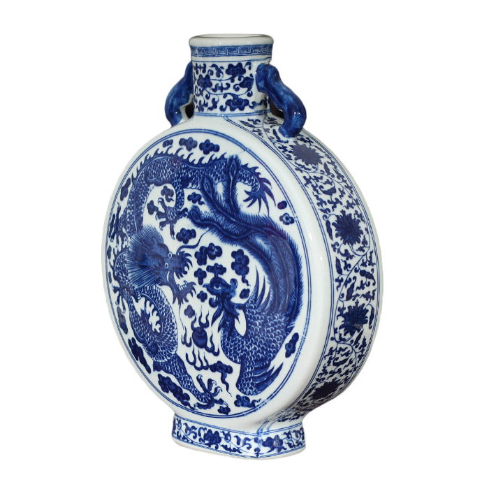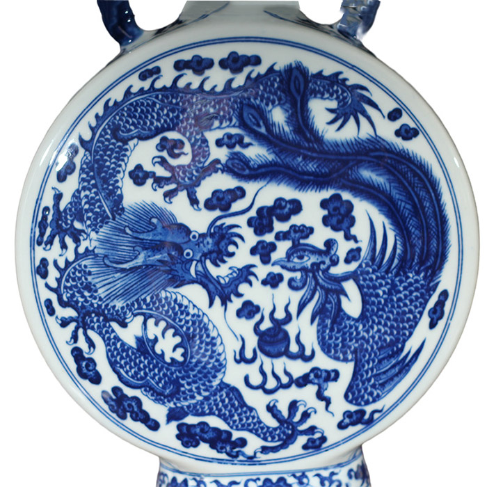 Blue and white porcelain flat porcelain vase with dragon and phoenix