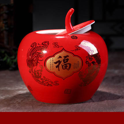 Red apple shape dragon and phoenix storage ceramic jar
