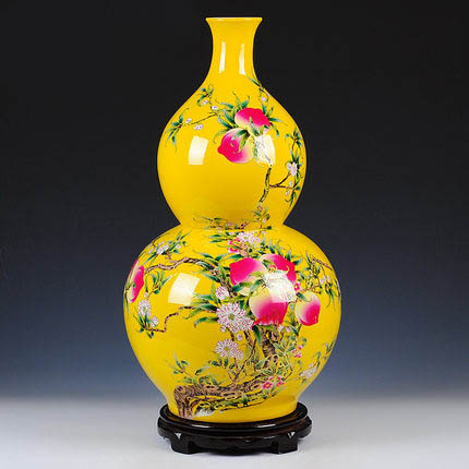 Yellow gourd shape ceramic vase with peach pattern on the ground