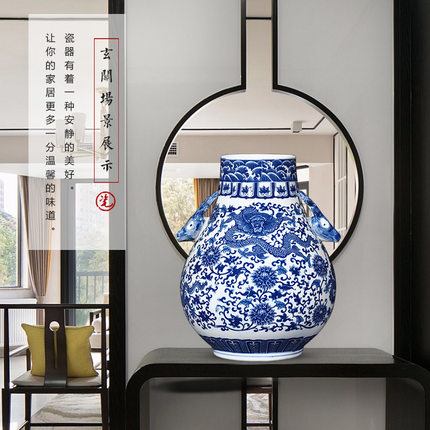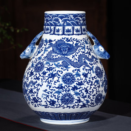 Blue and white dragon pattern ceramic vase with two ears
