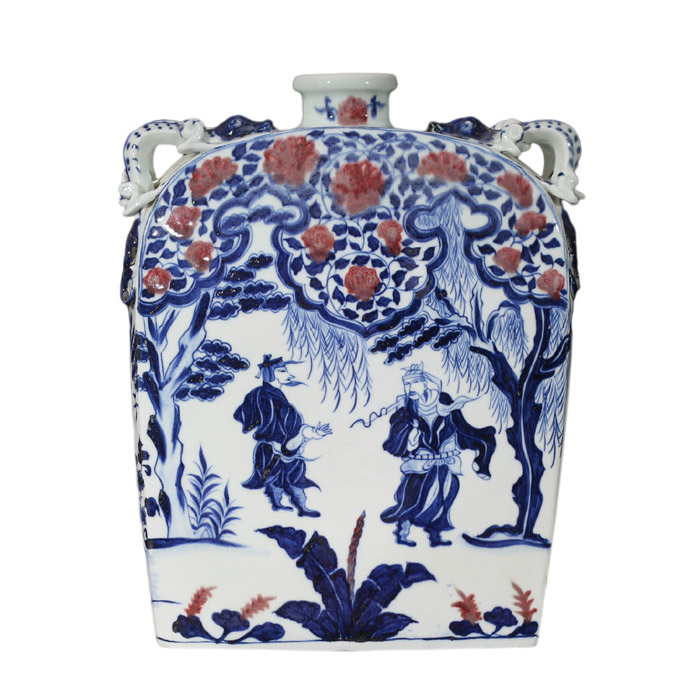 Vintage Yuan Dynasty blue and white glazed red flat pot vases