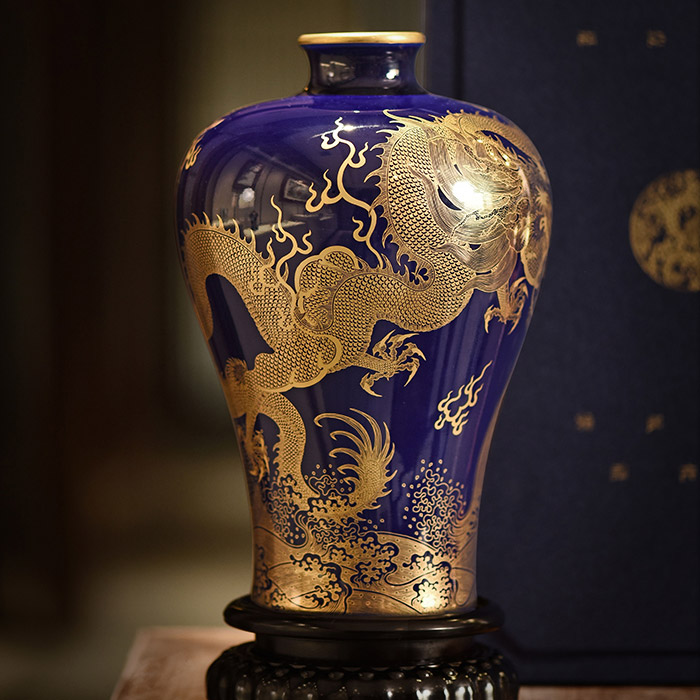 Blue mermaid ceramic vase with golden dragon ornaments for living room