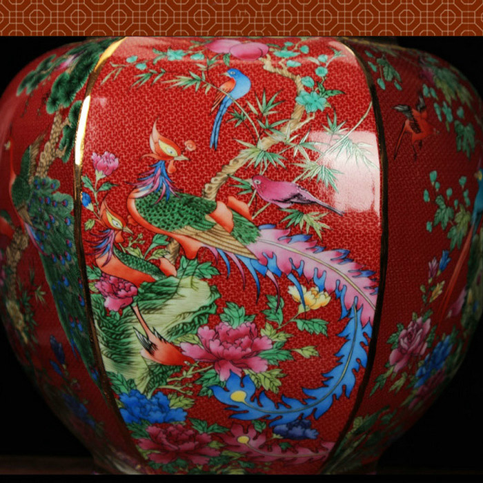 Vintage enamel color red hexagonal flower and bird square ceramic vase