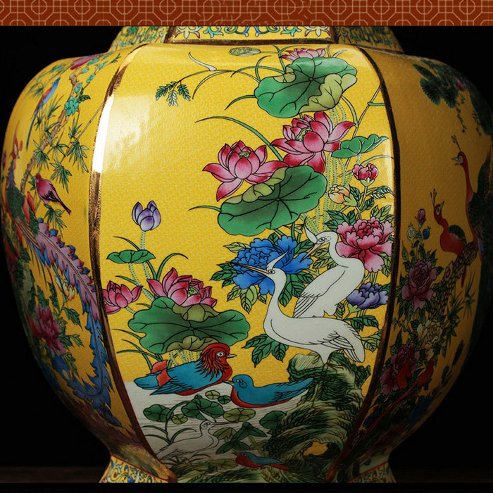 Enamel painted golden six-sided flower vase with birds and phoenixes