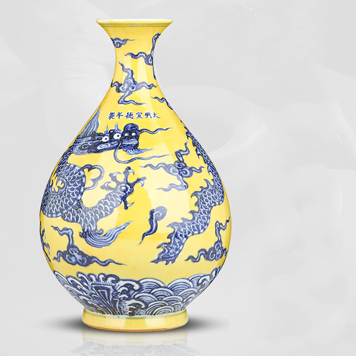 Vintage ming dynasty xuan de yellow background ceramic vase dragon on