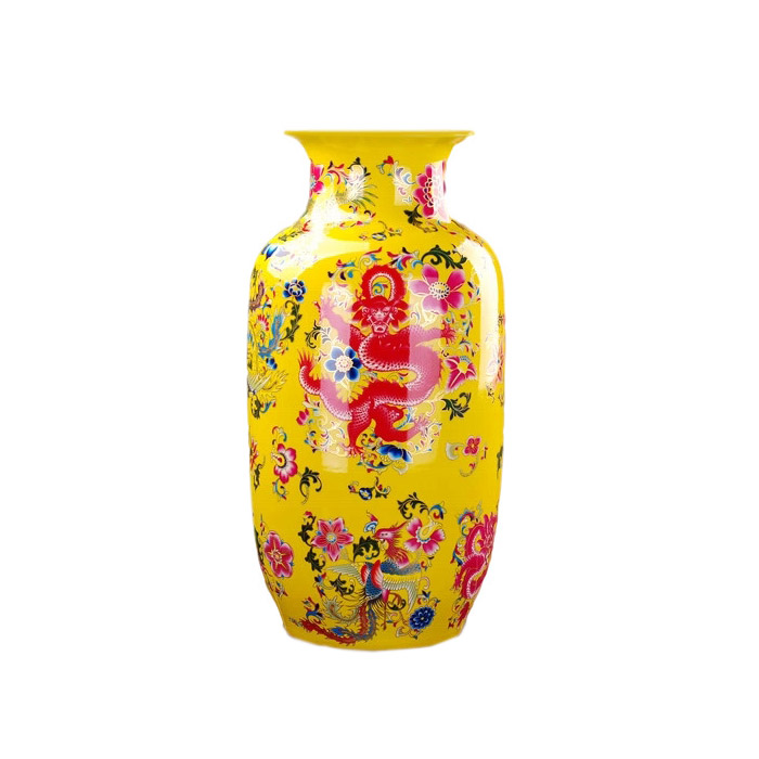 Extra large yellow in gold floor ceramic vase with dragon multiple