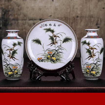 Three-piece birds and grass decoration ceramic hanging plate and vases