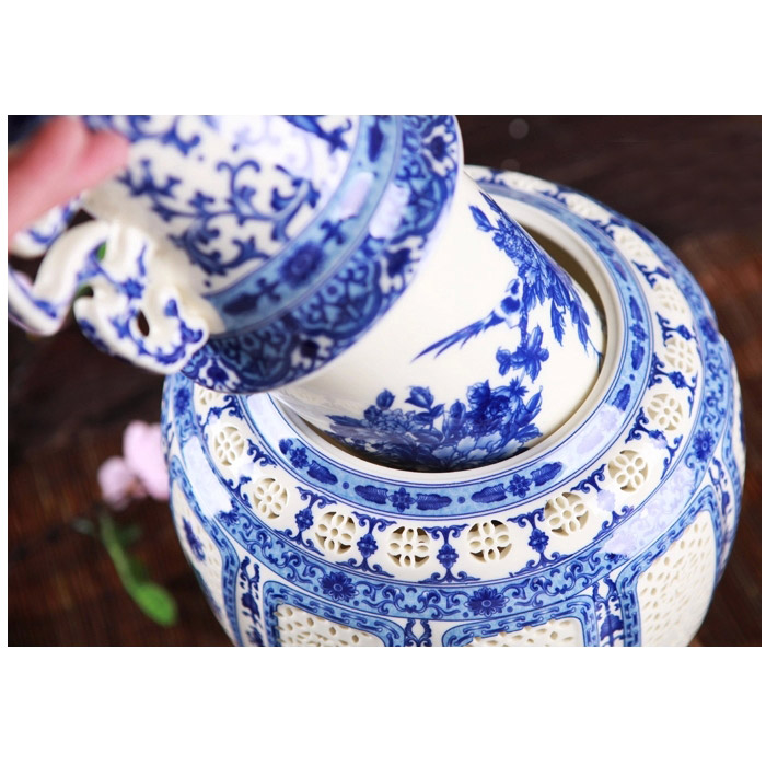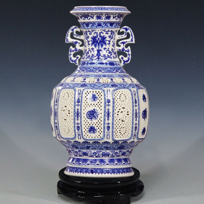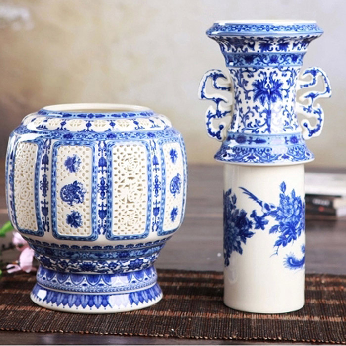 Blue and white porcelain double-layer hollow ceramic vase ornaments